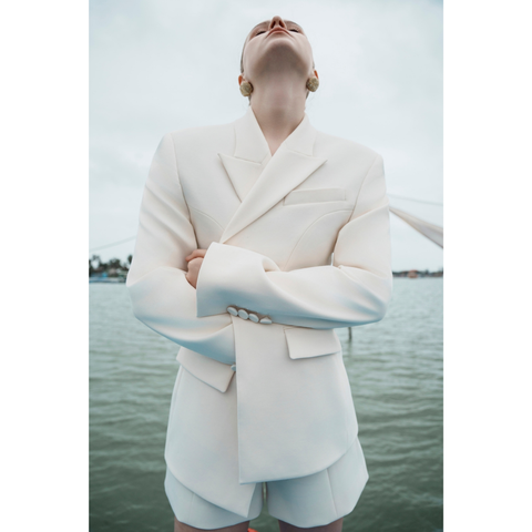 Conjunto de chaqueta de manga larga para mujer, ropa de mujer 2025, chaqueta con muescas CAMILLA, tela tejida de Spandex de rayón, etiquetas personalizadas, hormiga blanca